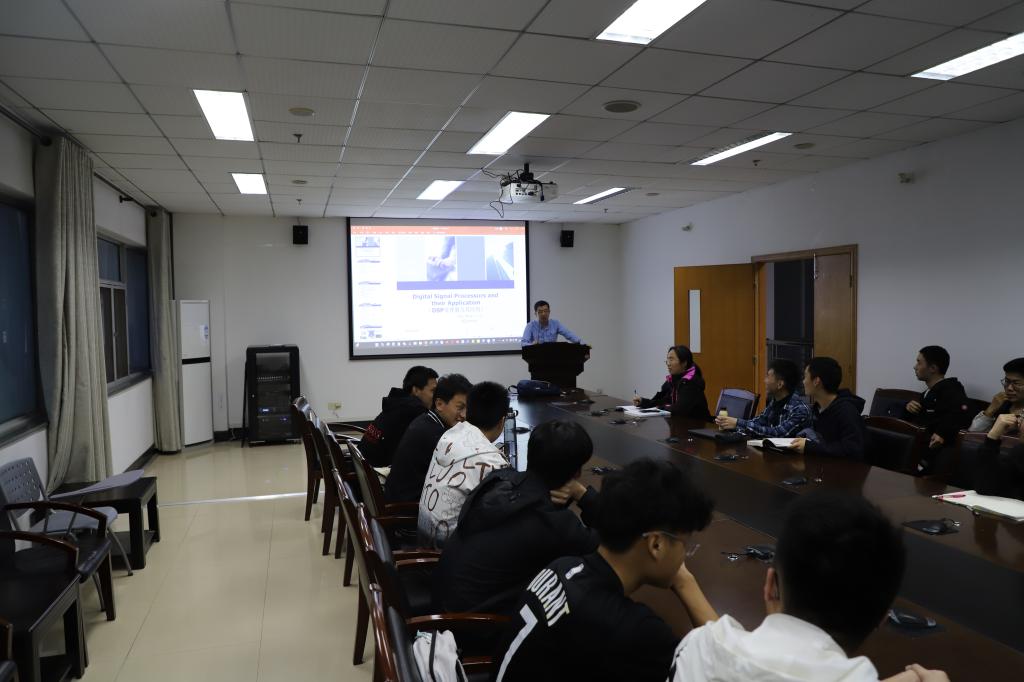 随后,朱明以学生实验实拍视频、实验芯片框图等方式向同学们展示课程体系架构的具体内容,包括DSP处理器及应用,软硬件平台设计,高级程序设计等。期间他提及的基于DSP处理器及汇编语言实现实时滤波和液晶显示,神经网络裁剪载入的有关实验内容,引起了同学们浓厚的兴趣和热烈的讨论。朱明表示,数字信号处理课程群以多学时的实验研发课程为特色,兼具底层硬件设计和高级算法设计,并且引进世界权威嵌入式系统教学方式,体系完整且丰富,能够很好地锻炼同学们的专业技能。