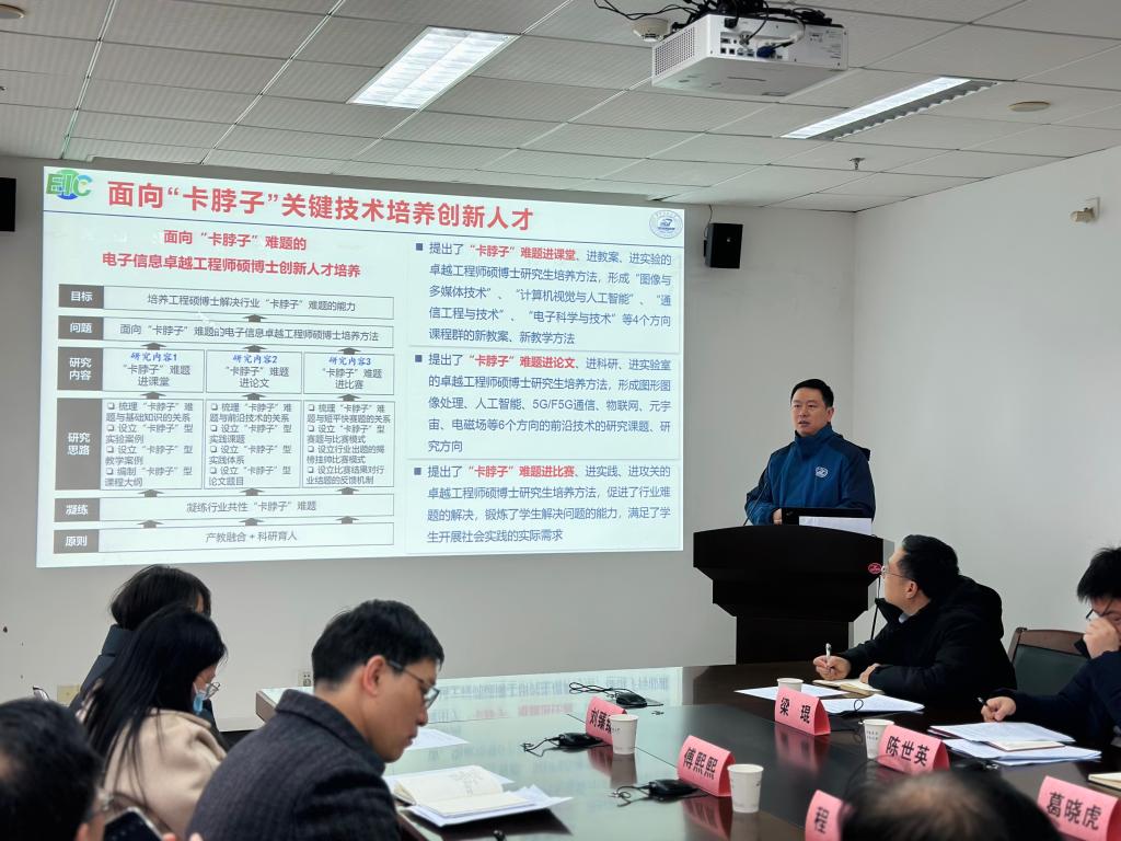 电信学院院长邱才明从学科实力、育人举措、科研教学成果等方面对学院人才培养情况进行了介绍,同时也指出了学院在人才培养方面存在的问题,希望与领导老师们一同深入交流探讨,寻求解决方案。