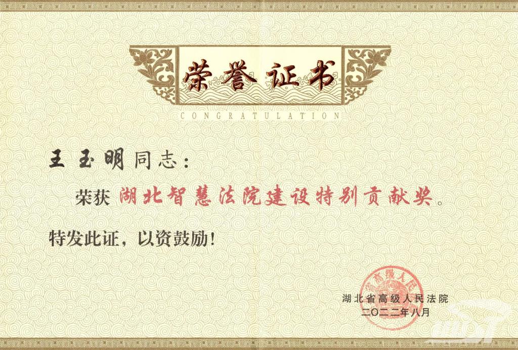 近日,湖北省高级人民法院向我校发来感谢信,感谢电信学院王玉明副教授在湖北省高级人民法院挂职期间敢于担当、主动作为,积极参与湖北法院信息化建设工作,为打造智慧法院建设“湖北模式”做出了重要贡献;并决定授予王玉明同志“湖北智慧法院建设特别贡献奖”。