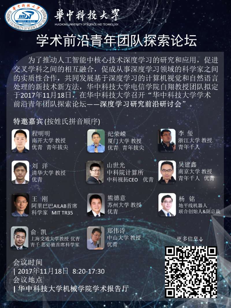 为了推动人工智能中核心技术深度学习的研究和应用,促进交叉学科之间的相互融合,促成从事深度学习领域的科学家之间的实质性合作,共同发展基于深度学习的计算机视觉和自然语言处理的新技术新方法,我院白翔教授团队拟定于11月18日在校召开“华中科技大学学术前沿青年团队探索论坛——深度学习研究前沿研讨会”。详见: