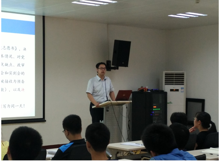 2015年6月11日上午8:30,电信学院党员发展规范专题讲座在南一楼西201报告厅顺利举行。校党委组织部谢宇翔老师应邀参与此次讲座并担任主讲嘉宾。参加此次讲座的还有电信学院党总支书记艾敏、电信学院党总支副书记周群伟、教职工党支部书记、全体学生辅导员、全体学生党支部书记、本学期拟发展对象以及部分有兴趣的党员、预备党员、入党积极分子等。主持本次讲座的是电信学院学生辅导员高骥老师。