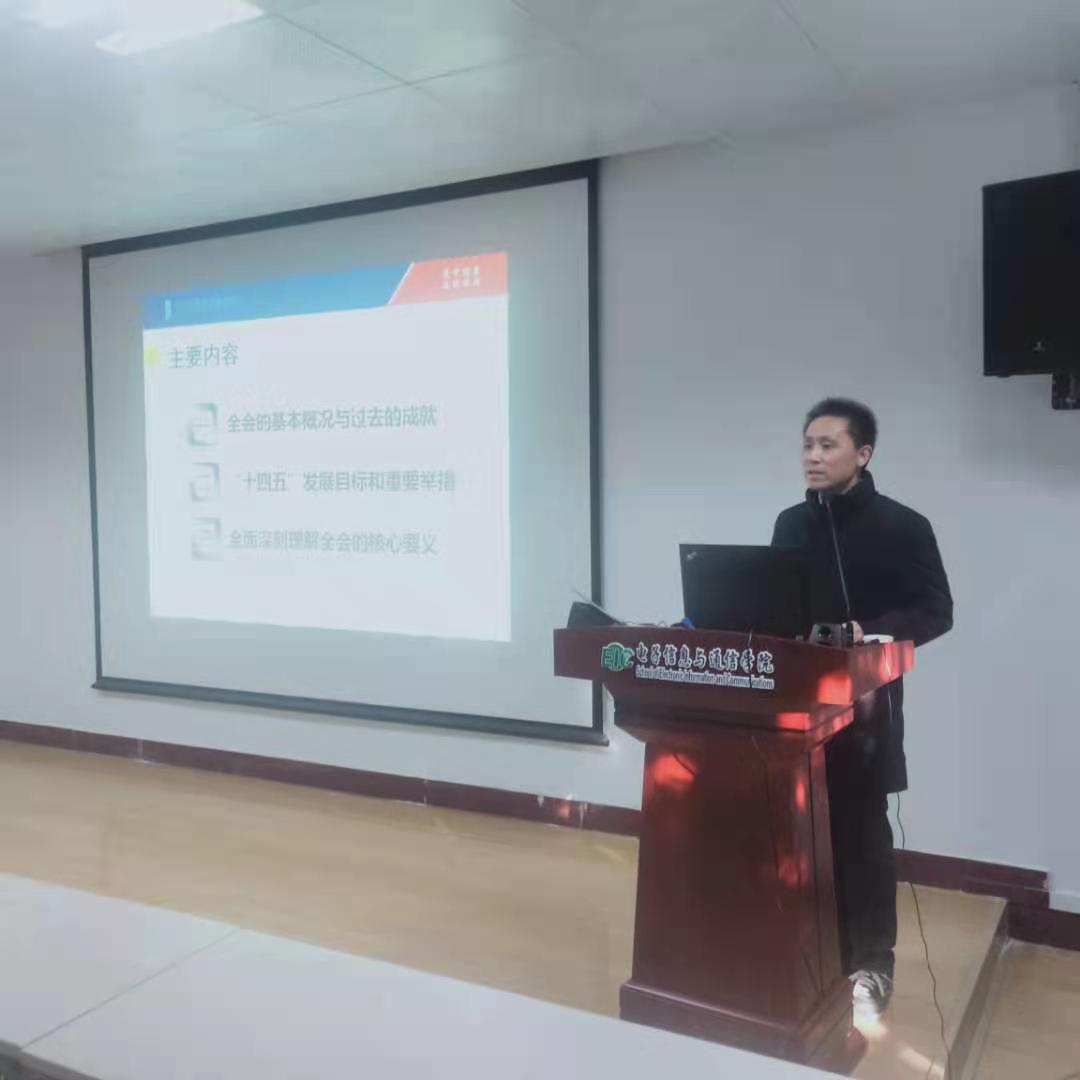 2020年12月31日,电信学院在学院报告厅举行学习贯彻十九届五中全会精神宣讲报告会。学校宣讲团成员、新闻与信息传播学院院长张明新教授以《开启全面建设社会主义国家新征程——学习贯彻党的十九届五中全会精神》为题,为全院教职工作宣讲报告。报告会由学院党委书记郑小建主持。