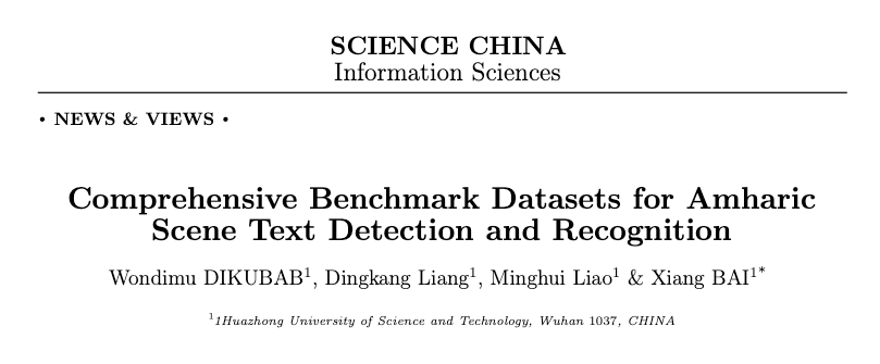 近日,电信学院2019级来华留学博士研究生王兴(WONDIMU GEBRE DIKUBAB,埃塞俄比亚籍),发布了首个阿姆哈拉语场景文字检测与识别综合公共数据集和初步的算法解决方案,其论文“Comprehensive Benchmark Datasets for Amharic Scene Text Detection and Recognition”发表在国内计算机领域顶级期刊《SCIENCE CHINA Information Sciences》上。