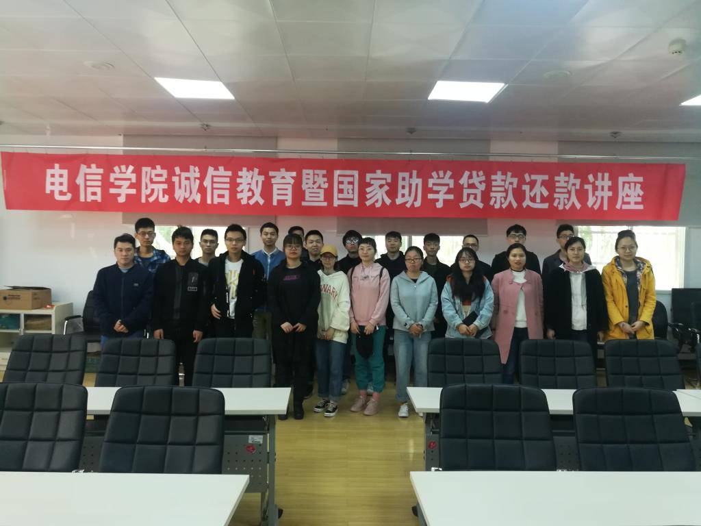 为强化学生的诚信意识,培养学生的诚信品质,强化资助工作育人成效, 4月12日中午12点半,在南一楼203报告厅举办了2019年度电信学院诚信教育暨国家助学金贷款还款讲座,校研究生资助管理团队柳梵云,电信学院德育助理,以及获得国家助学贷款的2018级和本届毕业生同学一同参与了本次讲座。