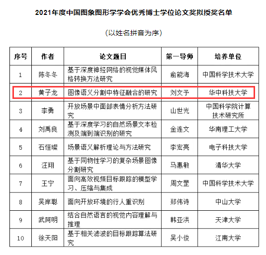 (通讯员 史师帅)11月21日,中国图象图形学会公布优秀博士学位论文获奖名单(公示期为11月21日至11月30日),电信学院刘文予教授指导的2020届博士毕业生黄子龙荣获2021年度中国图象图形学学会优秀博士学位论文奖。