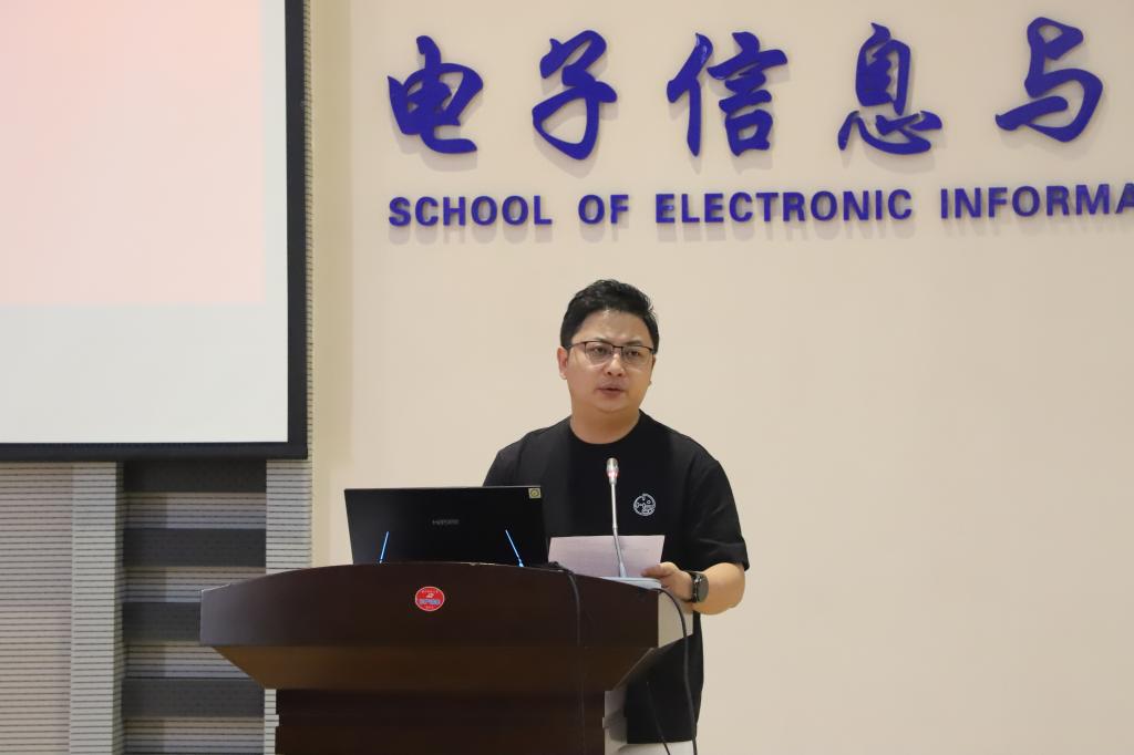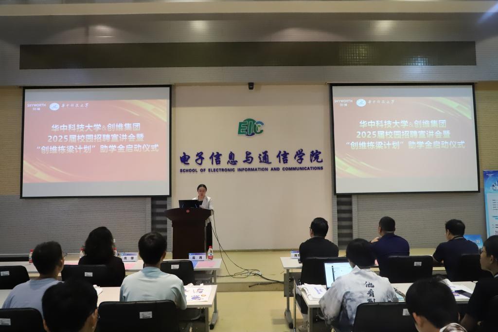 创维集团新闻发言人兼品牌部部长陶双华回顾了创维集团的发展历程。“创维栋梁助学金”项目由集团创维总裁施驰发起,致力于助力自立自强的大学生勇敢追梦。作为电信学院杰出校友,施驰始终心系母校,并以实际行动回馈社会、回馈母校。创维集团人力资源部部长徐立介绍了创维集团全球研发中心布局及产业优势,并热忱欢迎华科大优秀学子加入创维、携手追梦。