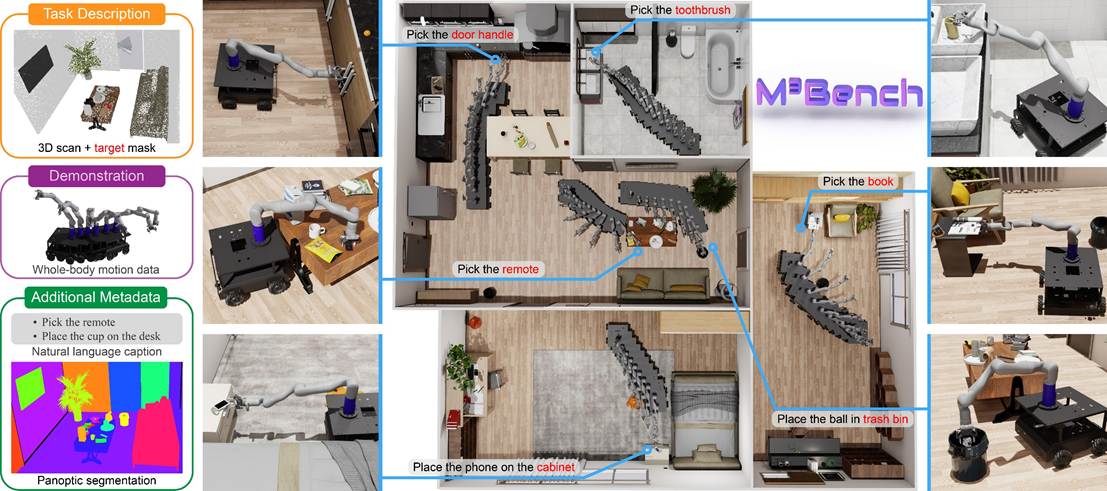 为了突破这些瓶颈,研究团队首先开发了 M3Bench ——一个涵盖 30000 个物体操作任务的移动操作基准测试平台,覆盖 119 种多样化的家庭场景。该平台不仅提供了丰富的专家演示数据,还配备了元数据采集接口,构建了从基础抓取到复杂场景操作的任务谱系。M3Bench 的开发为 M2Diffuser 提供了高质量的训练数据,确保了模型在复杂三维环境下的高效学习和优化能力。这一平台的出现,不仅解决了移动操作研究中缺乏标准化测试平台的问题,还为全身运动规划研究提供了系统化的评估框架,支持对运动生成算法进行全面验证。