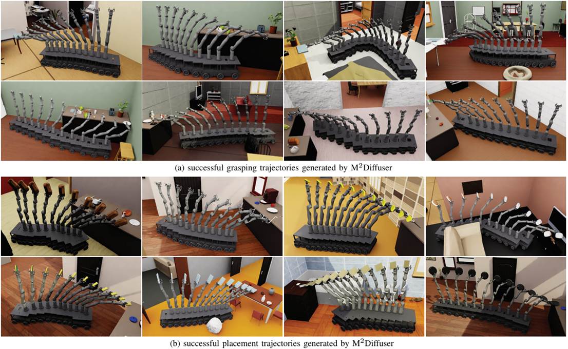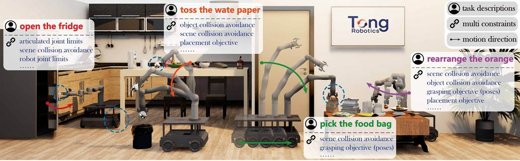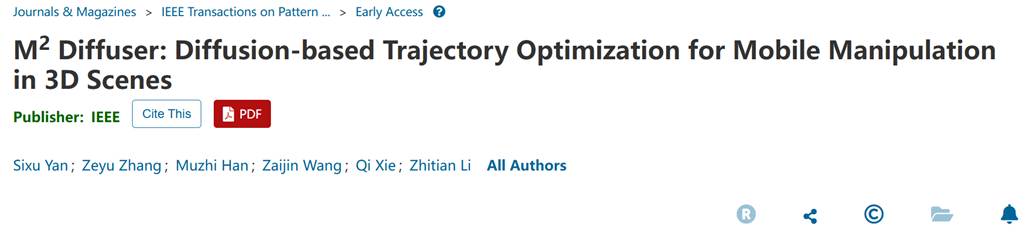 近日,华中科技大学电信学院与北京通用人工智能研究院(简称“北通院”)携手,在人工智能领域顶级国际期刊IEEE Transactions on Pattern Analysis and Machine Intelligence(IEEE TPAMI,影响因子20.6)在线发表了题为“M2Diffuser: Diffusion-based Trajectory Optimization for Mobile Manipulation in 3D Scenes”的重要研究成果。该成果为机器人在复杂三维场景下实现高效、精准的移动操作提供了全新的解决方案。论文第一作者为华中科技大学电信学院“通计划”2024级联合培养博士生鄢思旭。电信学院王兴刚教授与北通院刘航欣研究员为论文共同通讯作者。