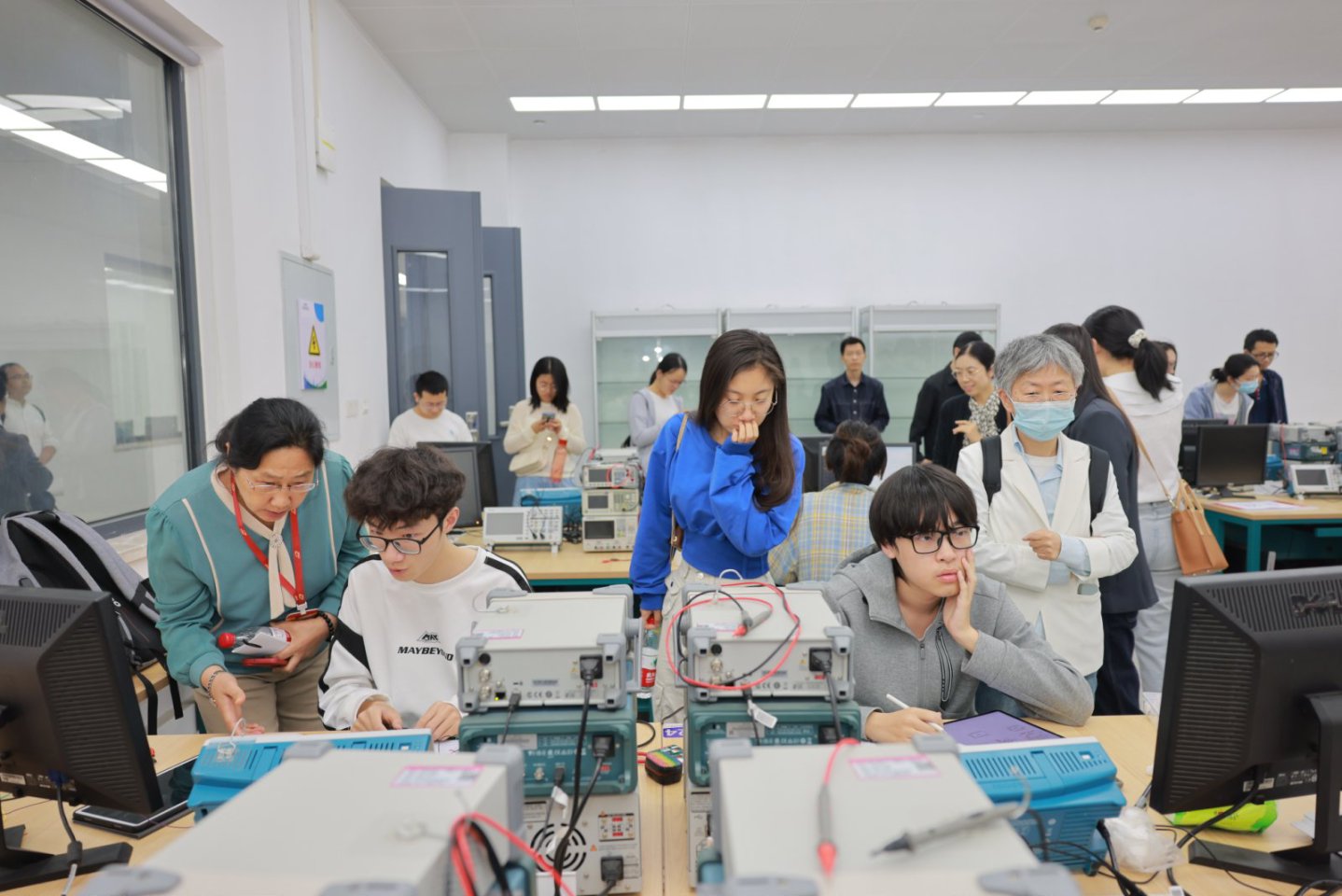 在参观环节,老师们在东十七楼F203教室,看到学生们正在使用实验教学数字化系统进行线下插板实验。该系统包含了预习检测、实验数据采集、在线报告和成绩报表统计等功能。通过该数字化系统,可以实现线下实验的全过程数字化。数据采集功能可以自动判断实验结果是否正确,并杜绝实验数据造假,也帮助老师掌握实验进度、了解学情。