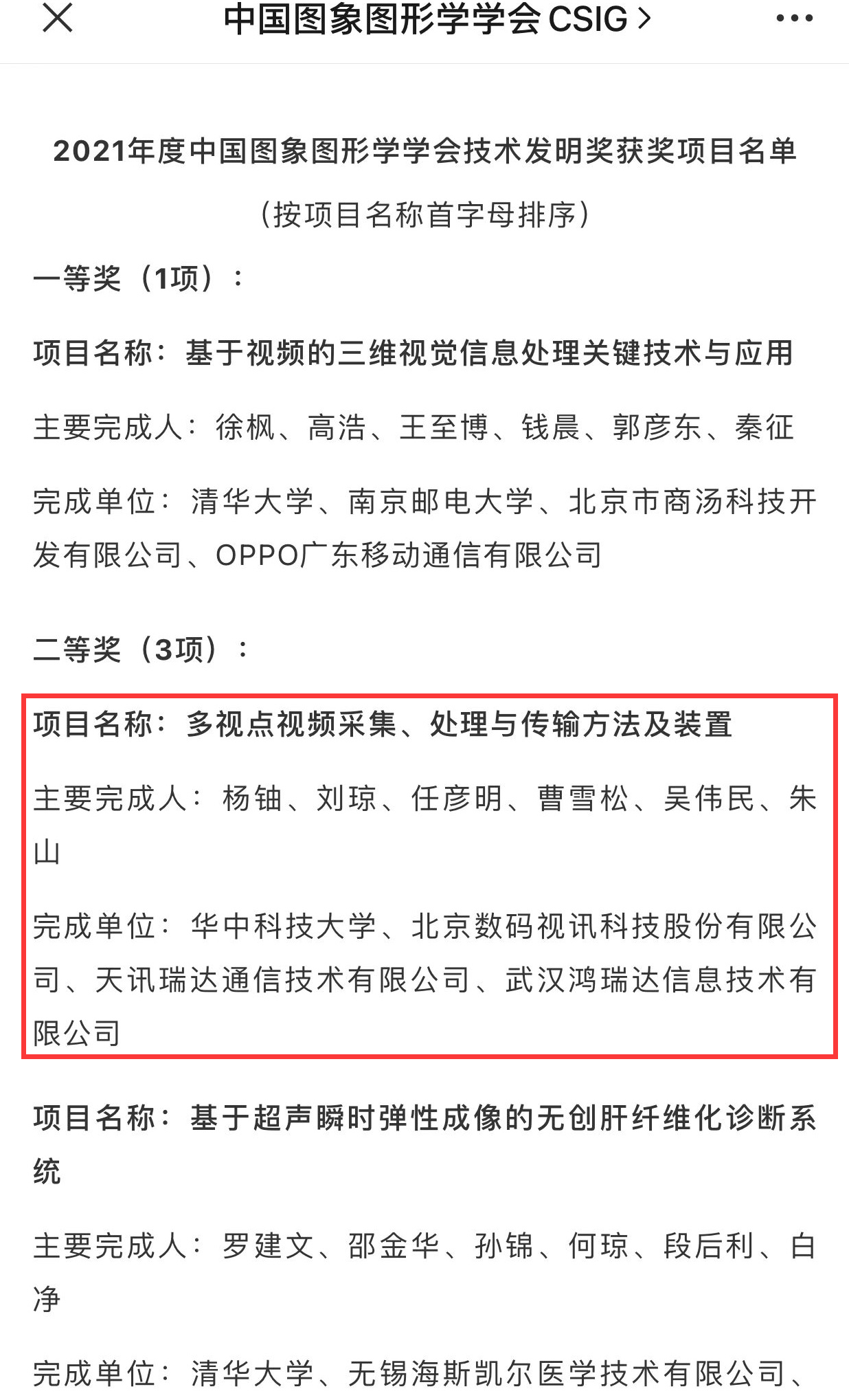 12月9日,中国图象图形学会公布了2021年度学会自然科学奖、技术发明奖、科技进步奖评选结果,电信学院杨铀教授作为主要完成人的成果“多视点视频采集、处理与传输方法及装置”获得技术发明二等奖。